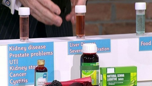 कार्यक्रममा उनले विभिन्न रङका पिसाबका नमुनाहरु राखिएका टेष्टट्युब देखाएका थिए जहाँ सफा पानीजस्तो पिसाबसँगै पहेँलो, रातो तथा निलो रङको पिसाबको नमूना थियो ।